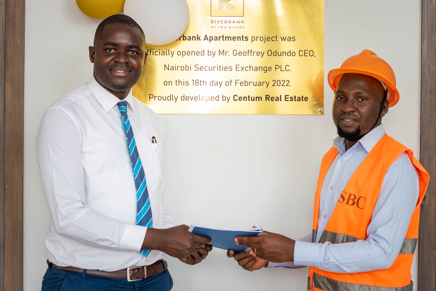 Sales Engineer Evanse Ongoro handing handing over a project after supplying various pool pumps and equipments to riverbank apartments a flagship proect by centum Real estate