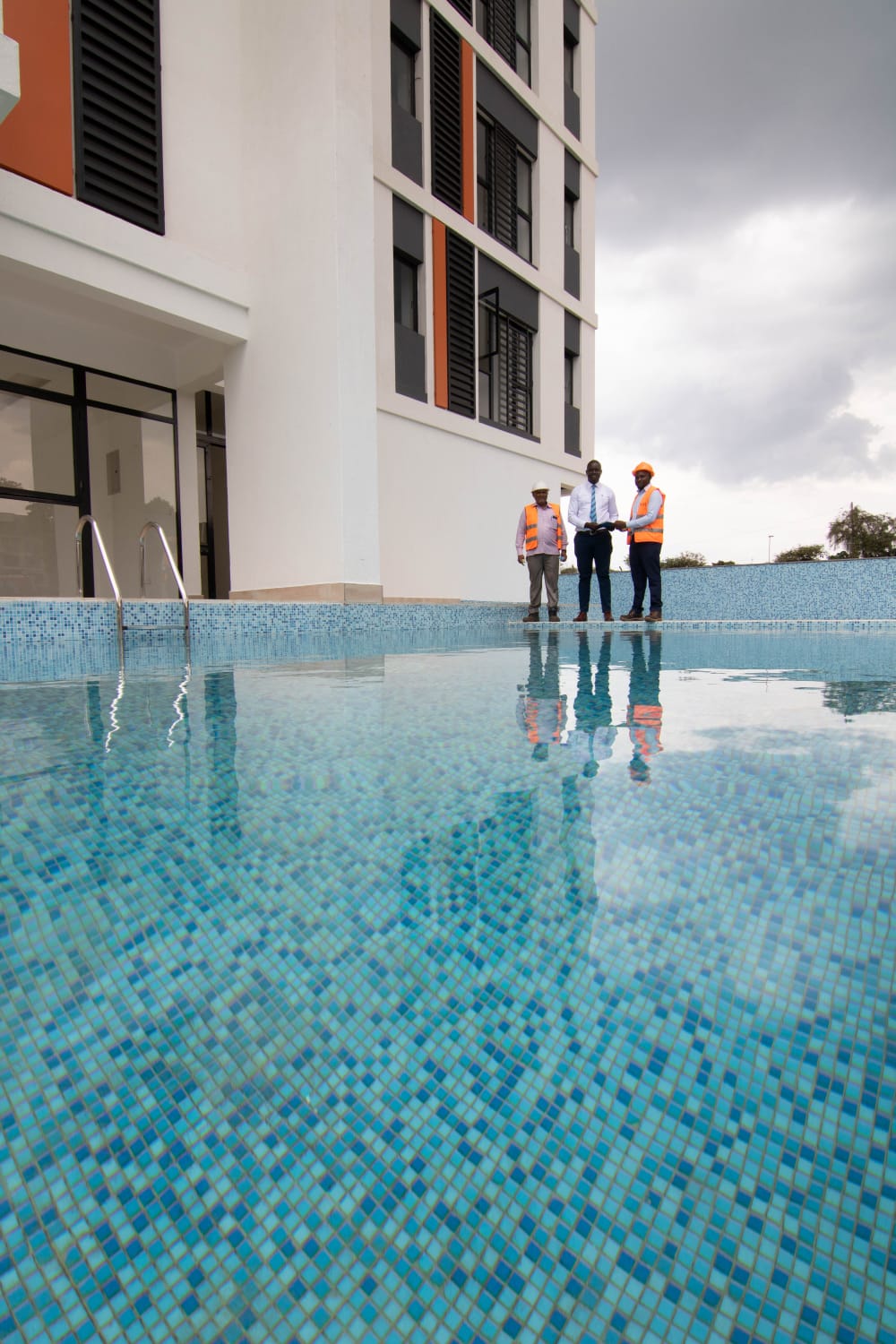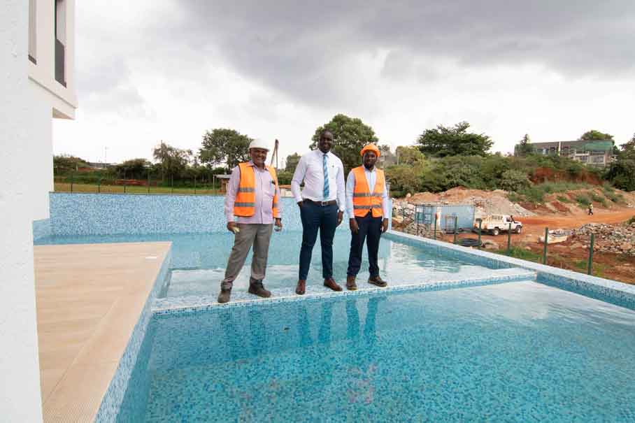 The stunning pool will provide residents with an improved environment. Pictured is D&S Engineer Evans Ongoro at the site with Quantity Surveyor Gerald Mbaabu and Seyani Brothers main contractor Kanti.